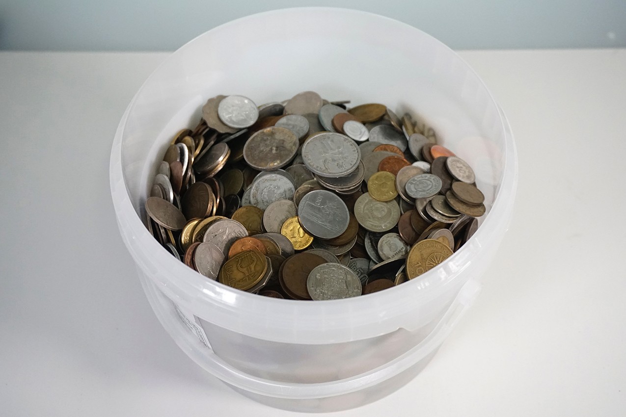 Plastic tonnetje ‘Fruitsalade’ met ruim 8 kg. eenvoudige wereldmunten; kilowaar.