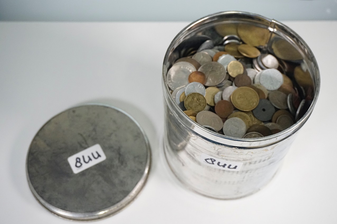 Rond blik met 6 kg. eenvoudige wereldmunten, kilowaar.