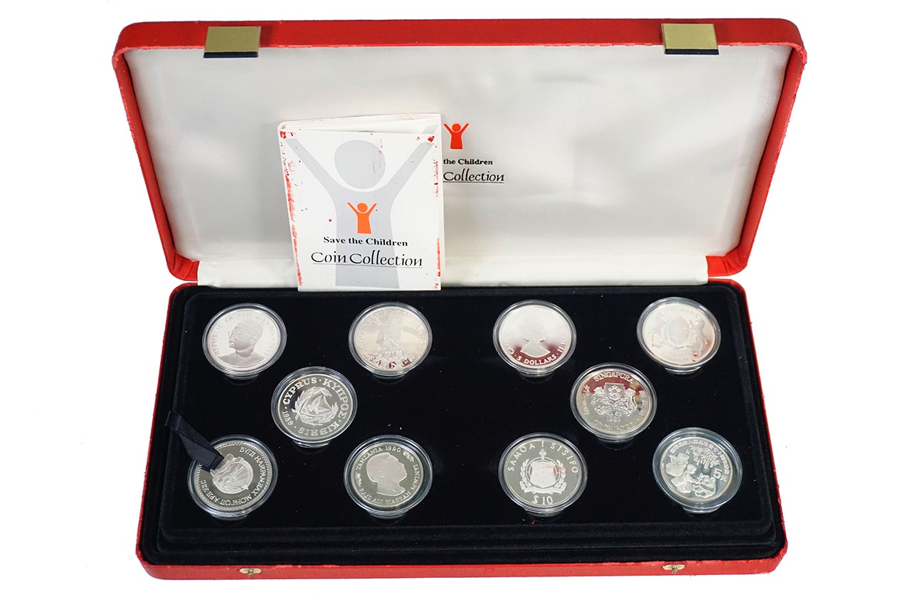 Rode cassette ‘Save the Children Coin Collection’ met 12 zilveren wereldmunten 1989, inclusief certificaten. Netto zilver: 292 gram.