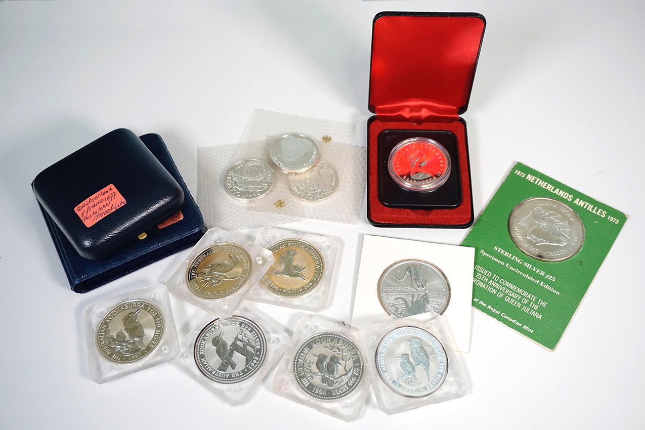 Kistje met 14 stuks zilveren munten, o.a. Australië Kookaburra.