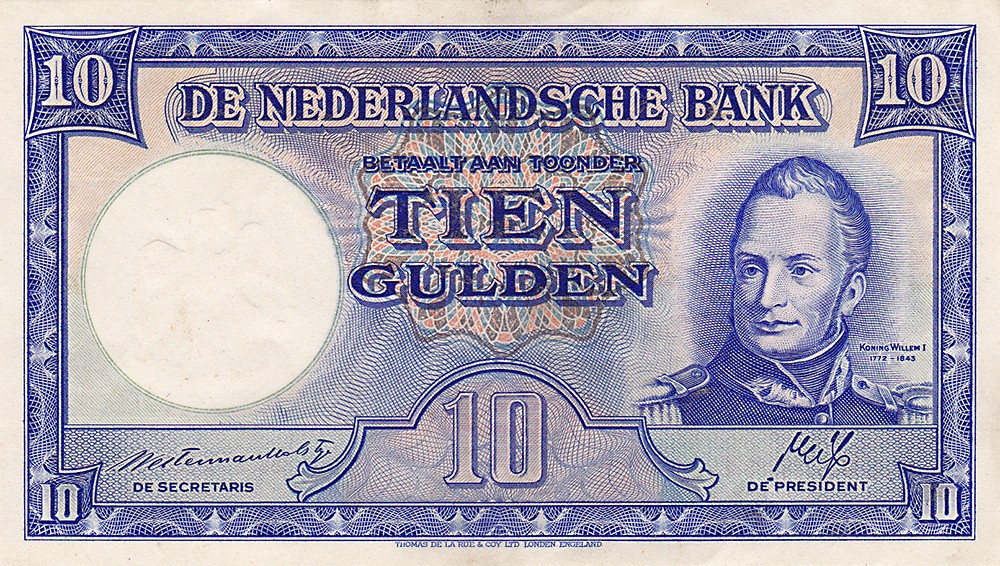 10 Gulden 1945-II Willem I / Mijn Oranje Nassau I. Mev. 46-1; AV 35.1b [# 3AZ934444]. Prachtig.