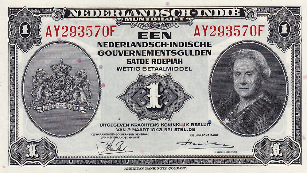 1 gulden muntbiljet 1943, 2-3-1943, serienummer AY293570f. Mev. 168; Pick 111. UNC