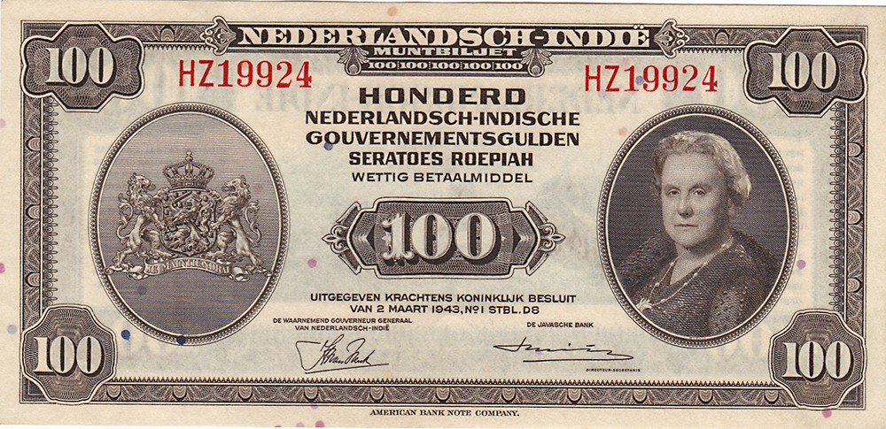 100 gulden muntbiljet 1943, 2-3-1943, serienummer HZ19924. Mev. 173; Pick 117. UNC