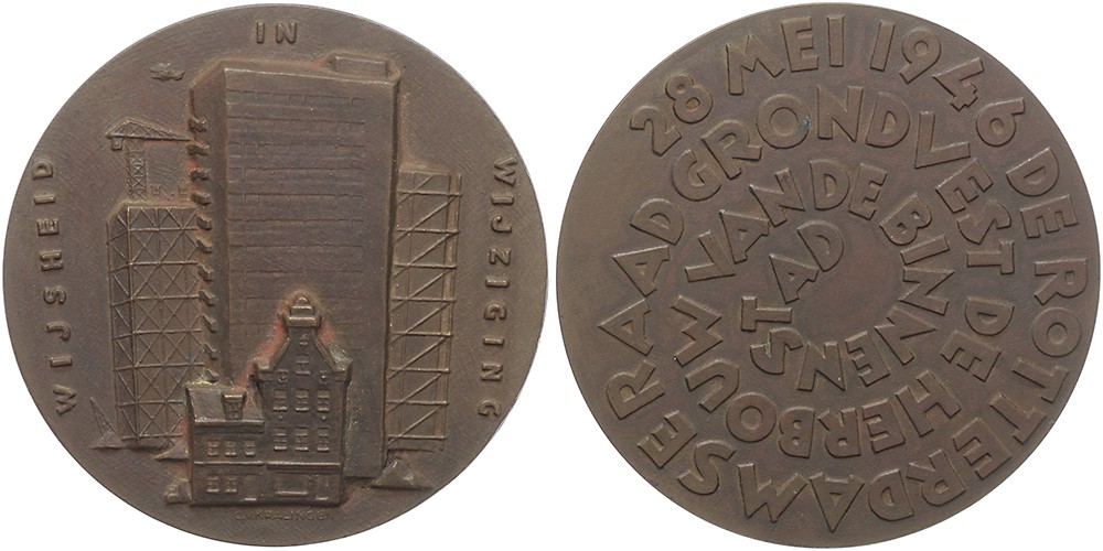 (1966) Rotterdam, 20 jaar basisplan herbouw. Hoge flats en traditionele panden. / Spiraalvormige tekst. Æ 65,5. KB VI-3201. Cor van Kralingen. Prachtig.