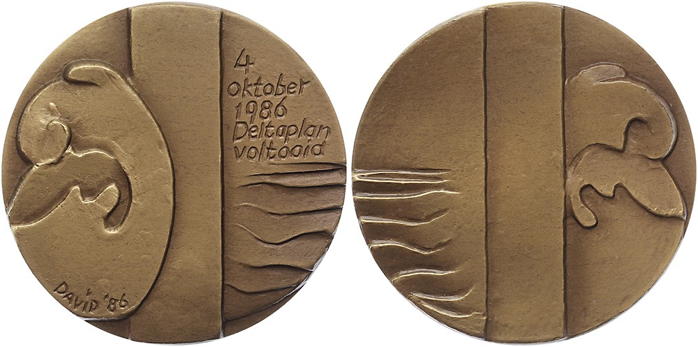 1986 Zeeland. Deltaplan voltooid. Golven tegen stormvloedkering. / Idem, maar gespiegeld.Æ 60. David van de Kop. In origineel doosje Begeer. Prachtig.