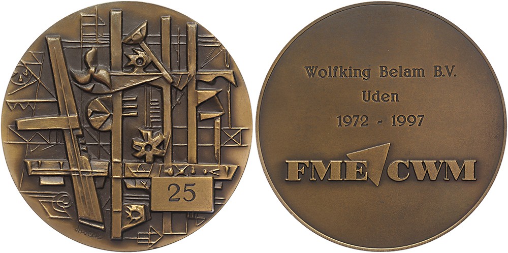 (1995) Erepenning Federatie voor de Metaal- en Electrotechnische Industrie (FME) & Contactgroep Werkgevers in de Metaalnijverheid (CWM). Compositie van diverse staalconstructies. / Inscriptieruimte boven FME/CWM. Op naam van: WOLFKING BELAM, UDEN. Æ 75 + originele plexiglas standaard. Jan Snoeck. Prachtig. N.B. De voorzijde dateert reeds uit 1959.