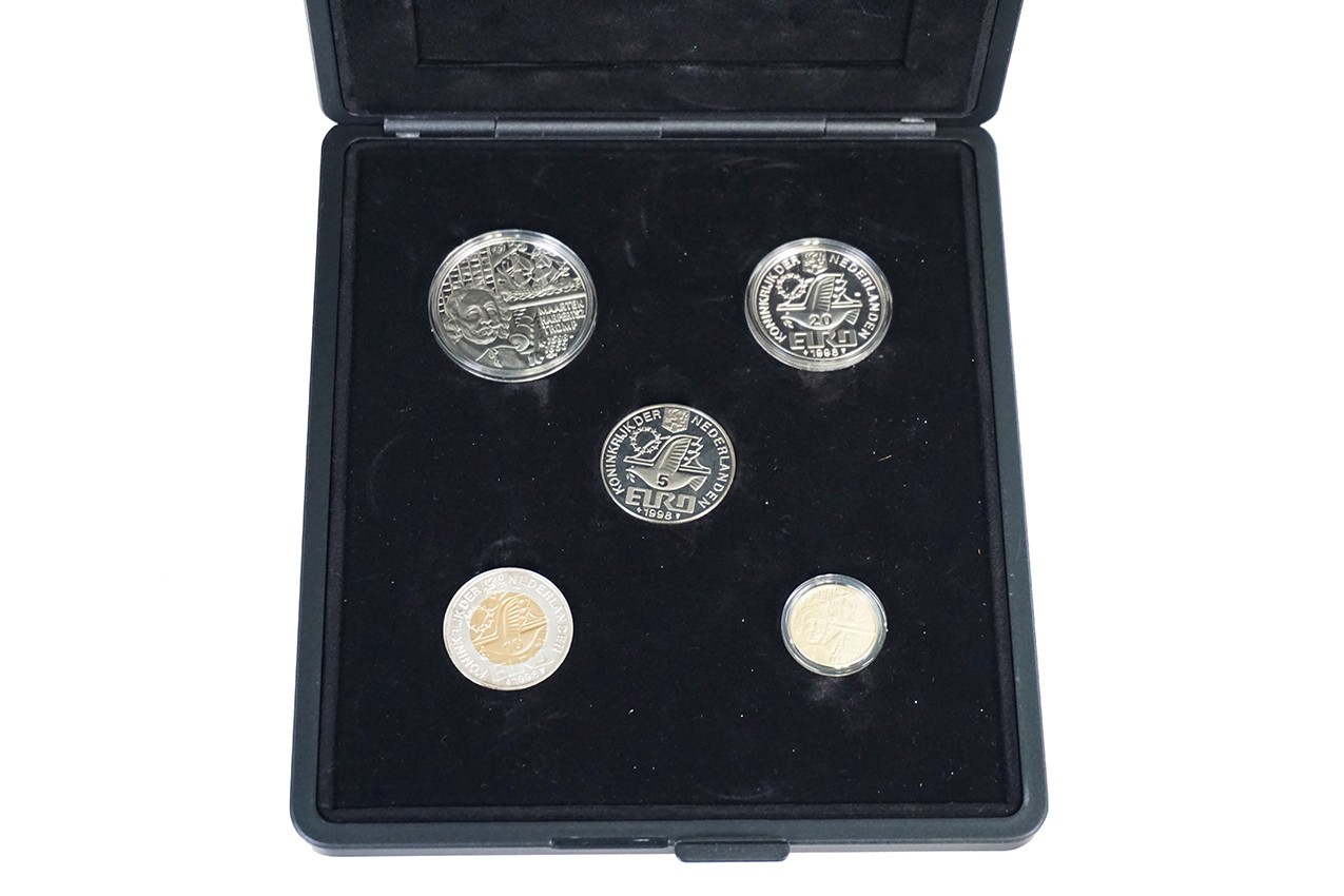 1998 Maarten Harpertsz. Tromp 1598-1653. Zwarte cassette (uitg. De Nederlandse Munt) met 5 – 10 – 20 – 50 – 200 euro. Kopernikkel, zilver en goud. Willem Vis. FDC / Proof.