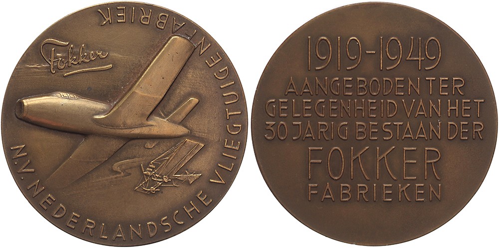 1949 Vliegtuigenfabriek Fokker 30 jaar. Straaljager boven Fokker’s 1e vliegtuig ‘De Spin’. / Zesregelig opschrift. Æ 60. KB V-1841. (Marinus Kutterink). Prachtig.
