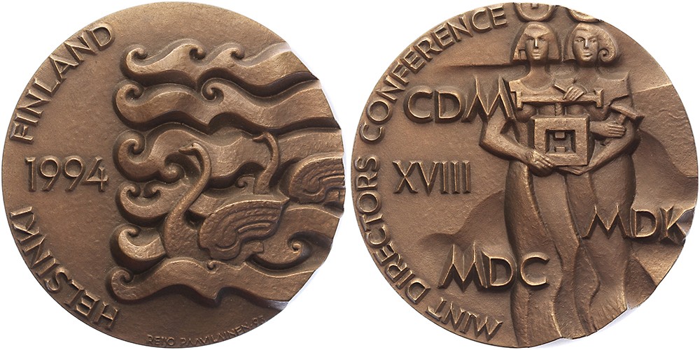 1994 Helsinki. XVIII Mint Directors Conference. Two stylized swans left in stylized waves. / Two women holding ancient mint press. Æ 60. Reijo Paavilainen. Original case. Unc.