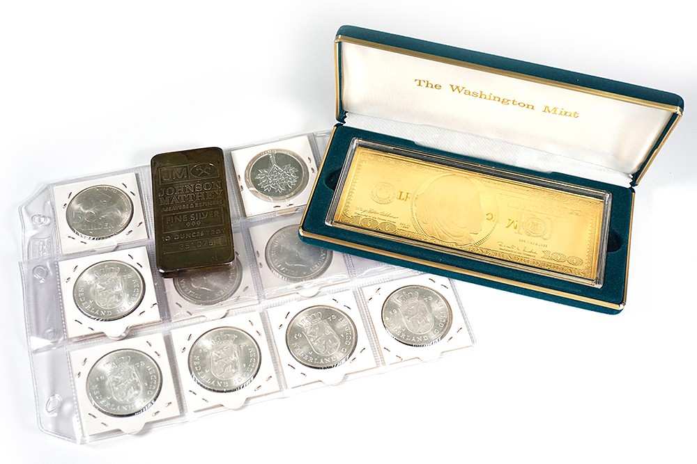 Doosje met ondermeer 3 x 10 Gulden 1970, 5 x 10 Gulden 1973, 1 x 50 Gulden 1982, 50 Shekel Israël, Baar van 10 troy ounce en baar zilver van 4 troy ounce, die bovendien bedekt is met 24 karaat goud!