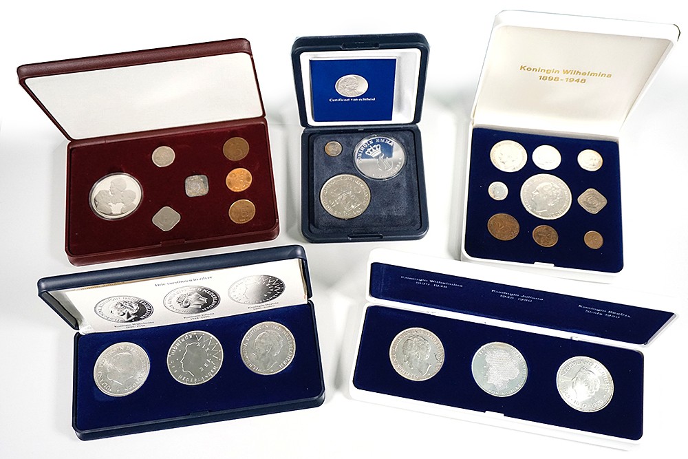 Schoenendoos vol met leuk samengestelde sets door de toenmalige NMB Bank te Amsterdam. O.a. Willem II, Willem III en Wilhelmina. Voornamelijk zilver!
