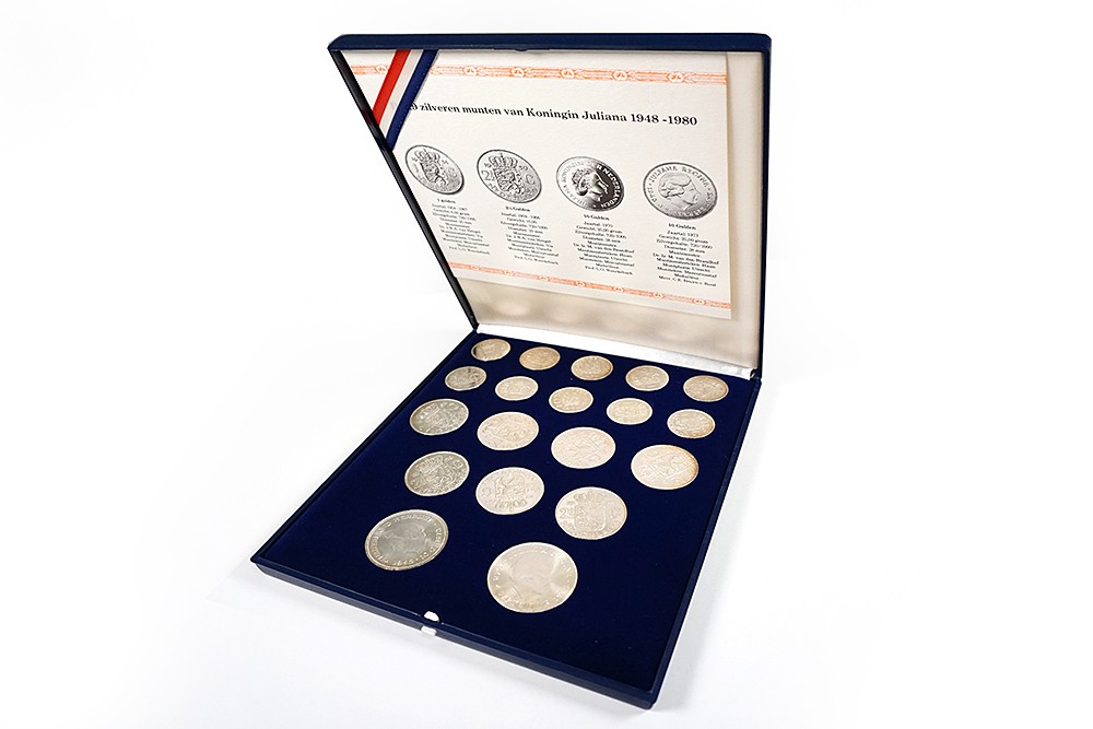 Juliana-cassette zilver, bestaande uit 10 zilveren guldens 1954-1967, 7 rijksdaalders 1959-1966 en 2 tientjes van 1970 en 1973.