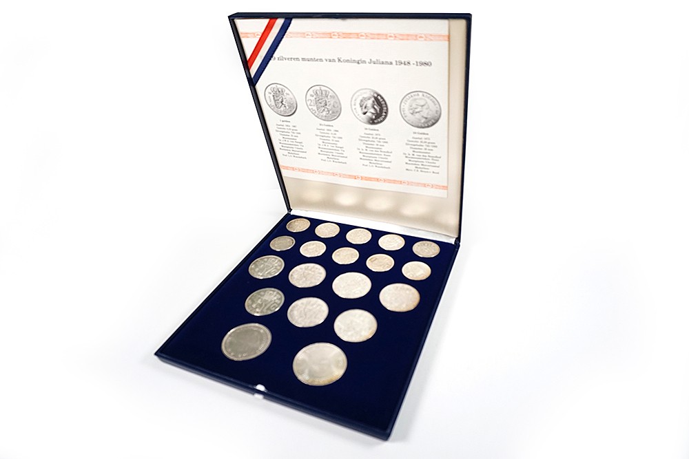 Juliana-cassette zilver, bestaande uit 10 zilveren guldens 1954-1967, 7 rijksdaalders 1959-1966 en 2 tientjes van 1970 en 1973.