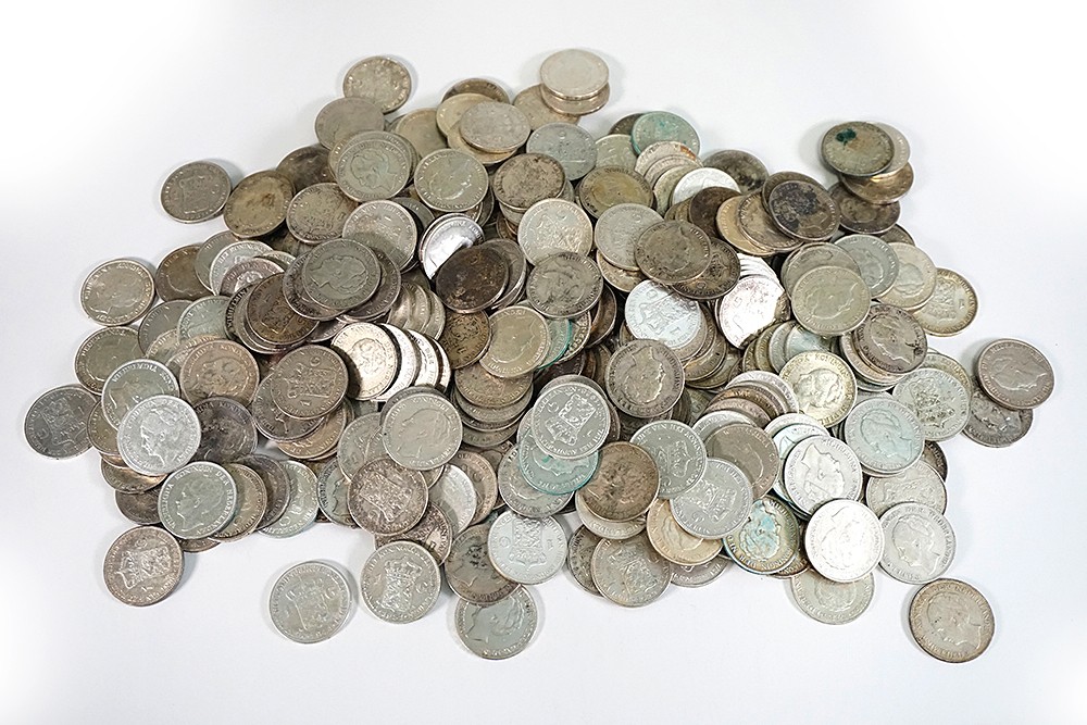 Oosters blikje (343) guldens Wilhelmina, laatste type, w.o. 1 x 1944DP. Netto zilver: 2453 gram.