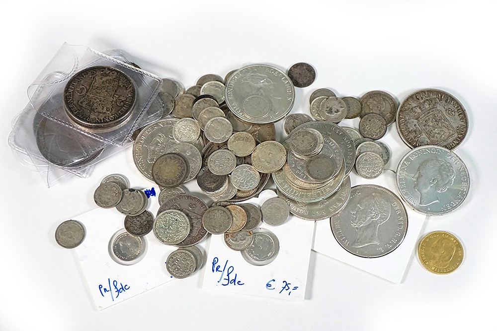 Klein doosje met uitsluitend zilveren koninklijke muntjes van 10 cent t/m rijksdaalder. Ondermeer rijksdaalder 1898 Wilhelmina. Fraai en beter.