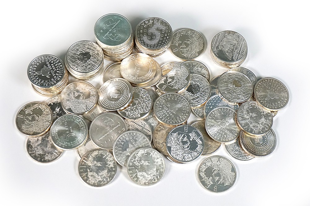 Doosje met zilveren € 5 herdenkingsmunten 2003-2007. Netto zilver: 924 gram, nominale waarde: 420,--