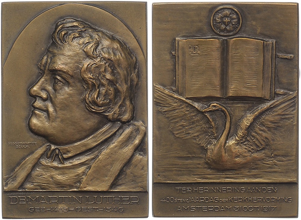 1917 Amsterdam, 400 jaar kerkhervorming. Borstbeeld van Maarten Luther in toga naar links. / Zwaan met gespreide vleugels onder opengeslagen bijbel. Æ rechthoekig 61 x 41. KB I-1247. G. Schwartze. Prachtig.