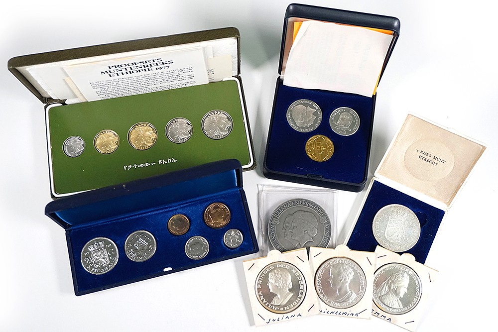 Lot zilveren penningen met onder meer Juliana en Bernhard, Emma, Wilhelmina en Juliana. Toegevoegd: inhuldigingsset 1980, zilveren tientje 1973 proof en proofset Ethiopië.