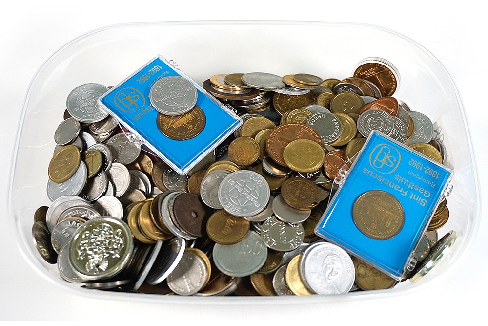 Plastic bak met ‘Kooij’-tokens. Zeer divers, ca. 4 kg.