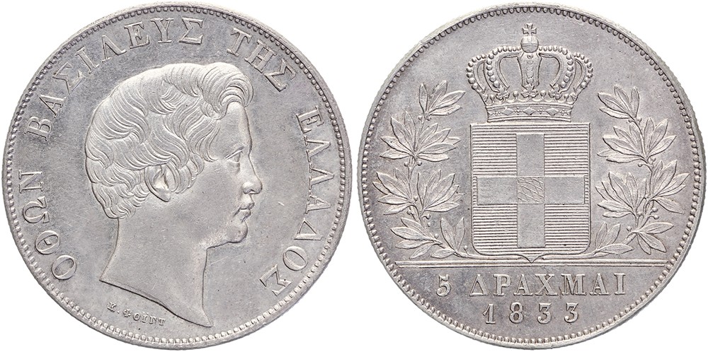 5 Drachmai 1833 without mintmark. Davenport 115; KM 20. EF.