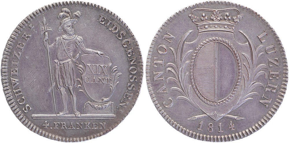 Neuthaler zu 4 Franken 1814. DT 53b; HMZ 2-668c; KM 109. Dark lustre. EF.