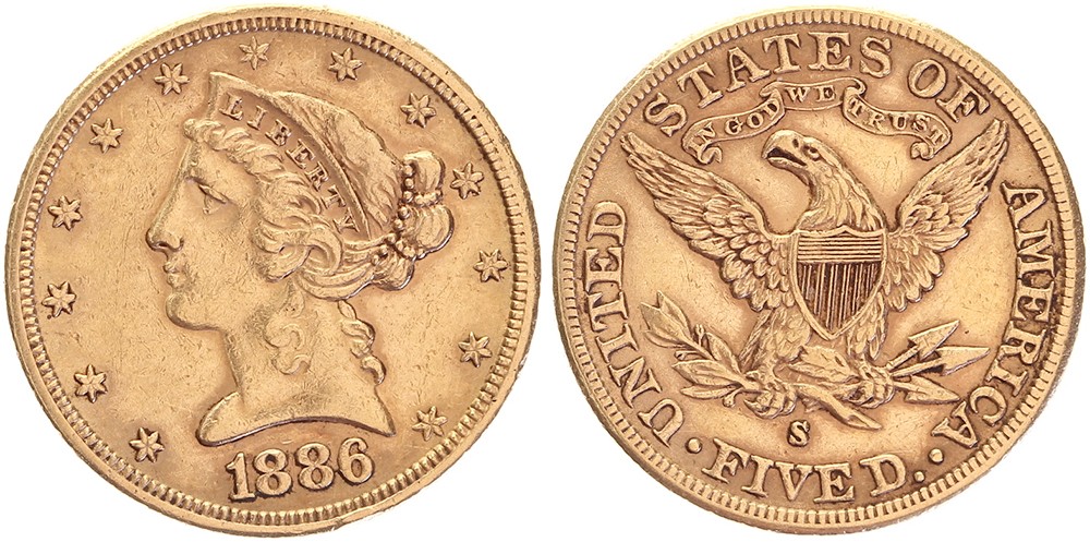 5 Dollars 1886S Coronet Head. Fr. 145; KM 101. Good VF.