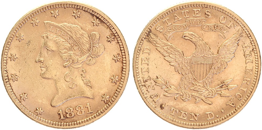 10 Dollars 1881 Coronet Head. Fr. 158; KM 102. Near EF.