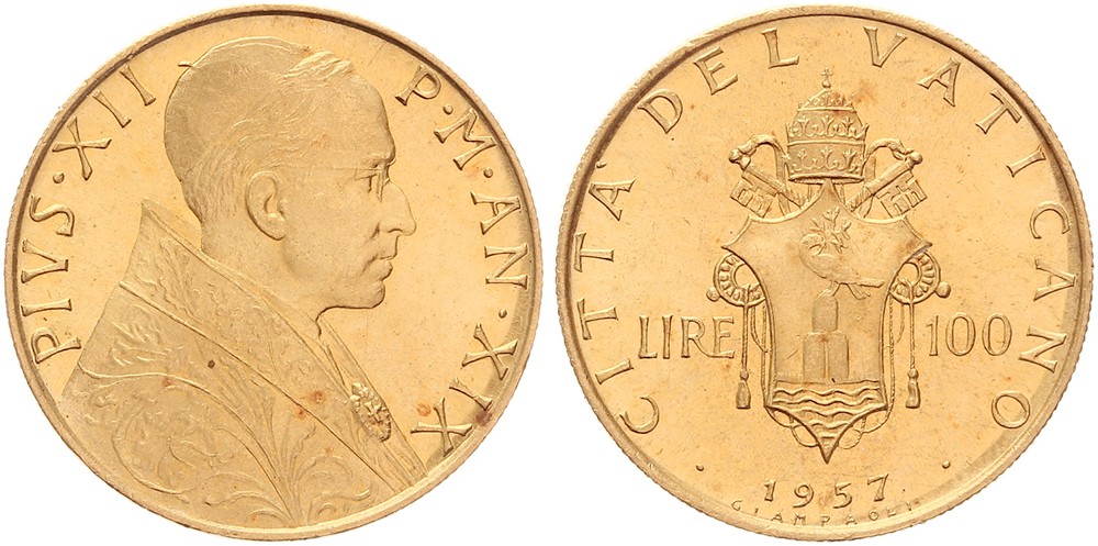 100 Lire 1957 Bust / Papal arms. Fr. 291; KM A53. EF.