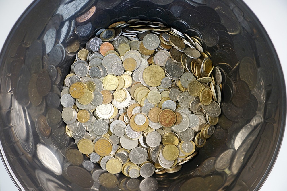 Blauw tonnetje ‘strooizout’ met ruim 15 kg. eenvoudige wereldmunten, kilowaar.