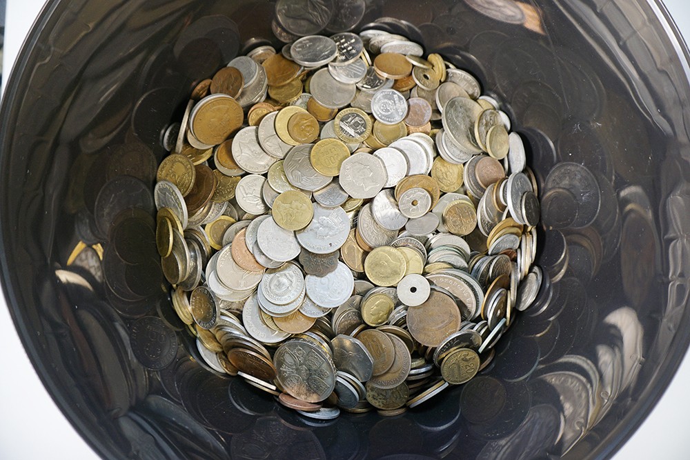 Blauw tonnetje ‘strooizout’ met ruim 15 kg. eenvoudige wereldmunten, kilowaar.
