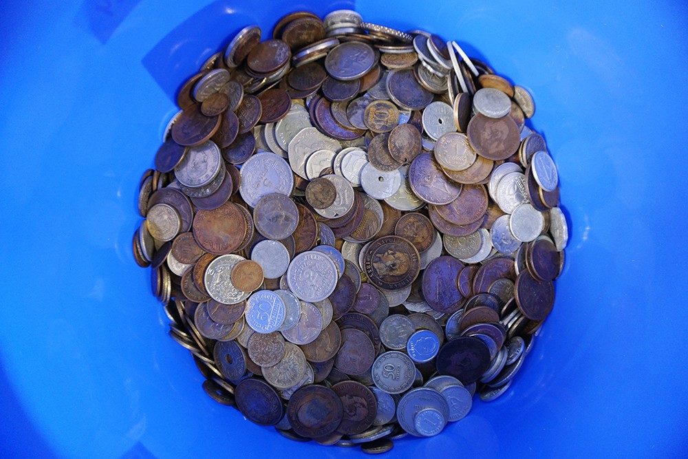 Blauw/rood emmertje met ruim 16 kg. eenvoudige wereldmunten, kilowaar.