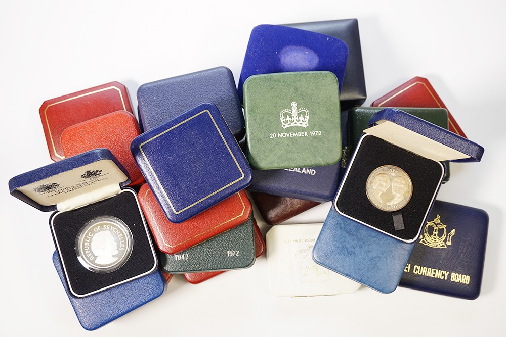 Doos met ca. 25 stuks vnl. moderne crownsize coins uitgegeven door Franklin Mint, o.a. Irak, Samoa, Bermuda, Isle of Man, Guernsey, Tristan da Cunha, etc.