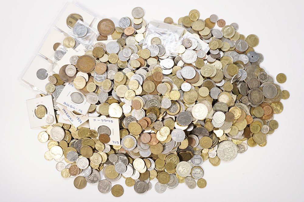 Doos met ca. 6,5 kilo wereld waaronder ook enige zilveren munten.