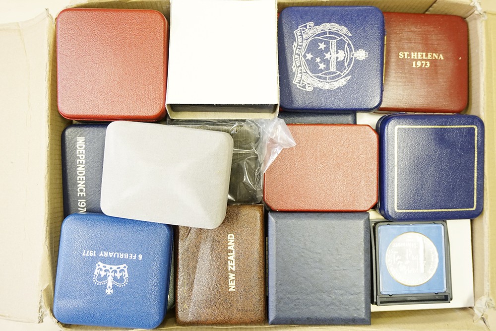 Doos met groot lot (ca 85 stuks) vnl. moderne crownsize coins o.a. Canada, Nieuw Zeeland, Tonga, St. Helena, Jamaica, Cyprus, Singapore etc.