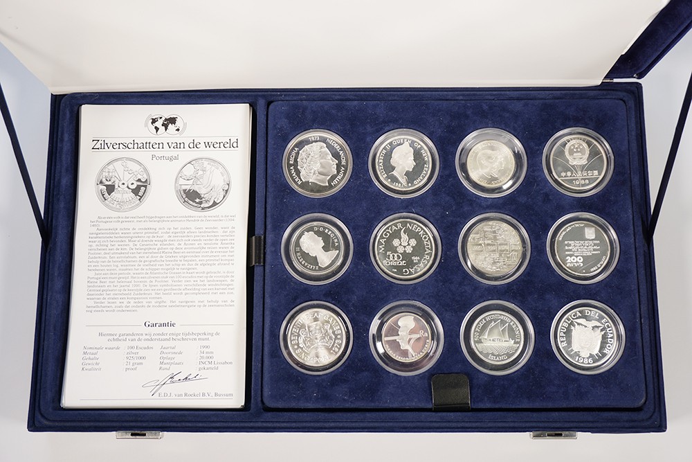 Fraaie blauwfluwelen cassette “De Zilverschatten van de Wereld”, met 24 zilveren munten diverse landen. Incl. bijbehorende certificaten. Netto zilver: 511 gram.