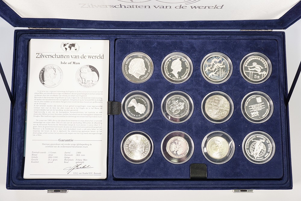 Fraaie blauwfluwelen cassette “De Zilverschatten van de Wereld”, met 24 zilveren munten diverse landen. Incl. bijbehorende certificaten. Netto zilver: 511 gram.