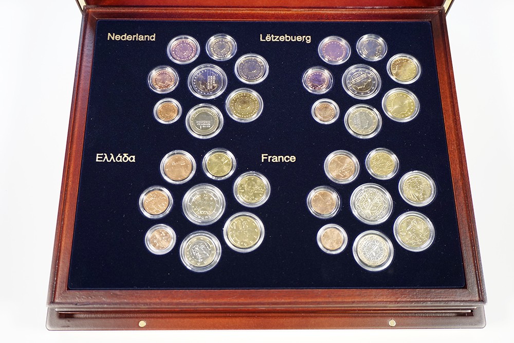 Luxe kist met Euromunten uit 16 lidstaten; denominaties van 0,01 t/m 2 euro.