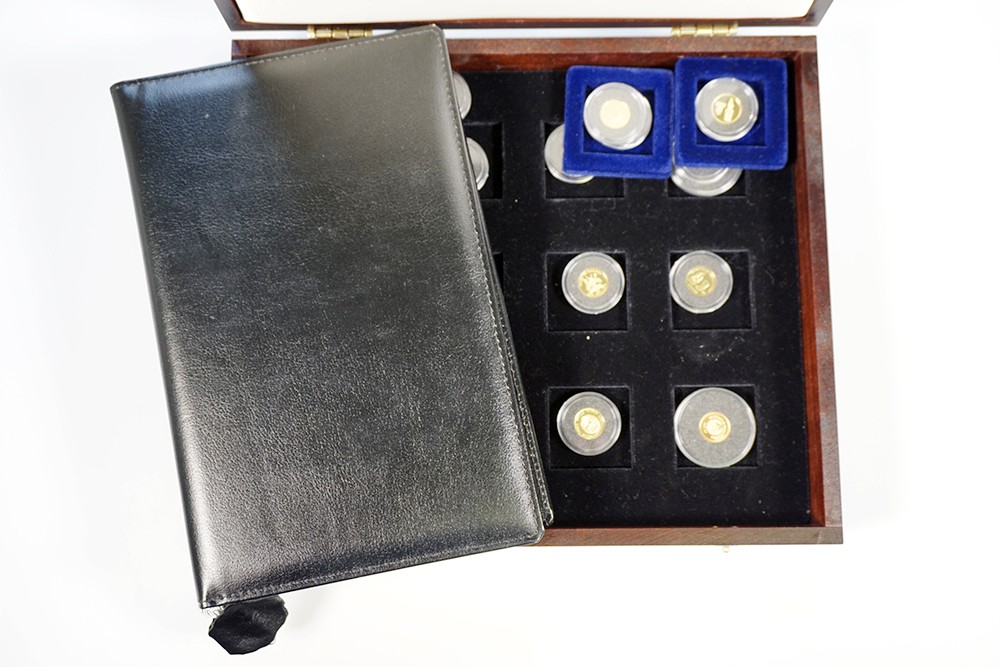 Houten kist “Kleinste Gouden Munten-Collectie” met 19 gouden muntjes diverse landen; allen Ø 14 mm. en allen 1/25 Troyounce. Incl. certificaten. Netto goud: 25,15 gram.