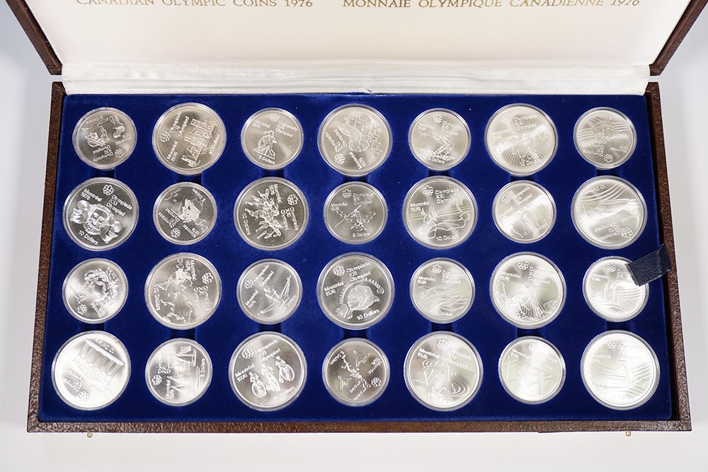 Canada. Bruine cassette Olympische Spelen 1976 Montreal; 14 x Can.$5 en 14 x Can.$ 10 in uncirculated. Netto zilver: 944 gram.
