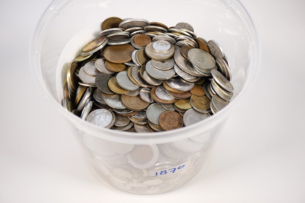 Transparant plastice tonnetje ‘Haribo’ met 7 kg. eenvoudige wereldmunten, kilowaar.