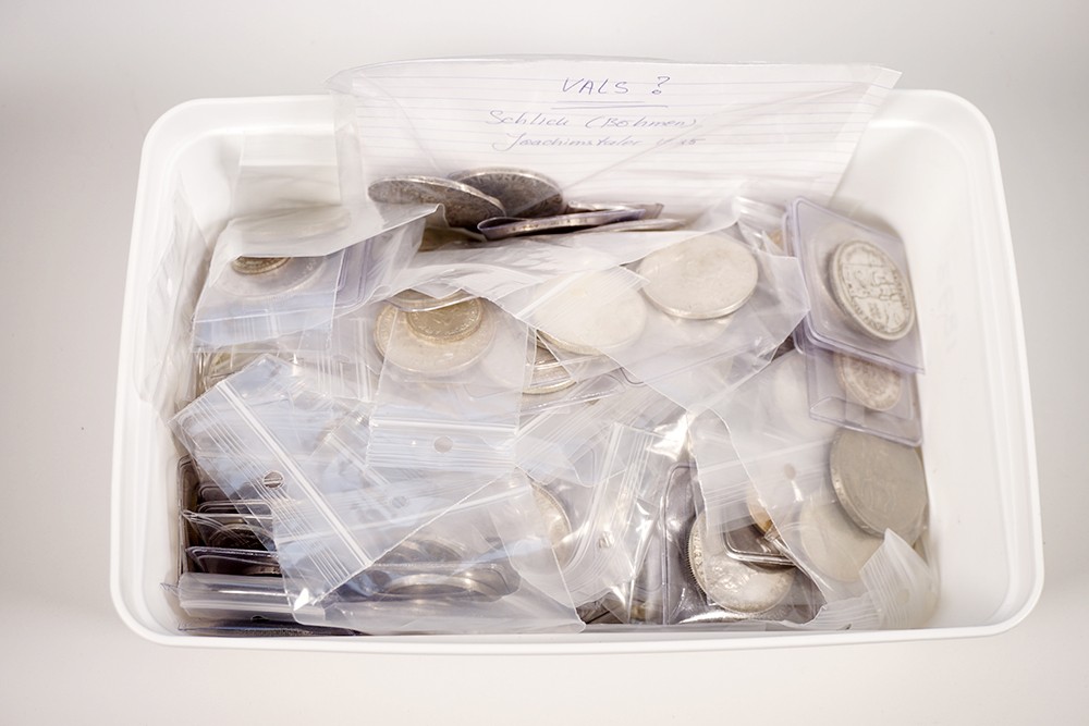 Plastic ijsbox met honderden wereldmunten; veel zilver. 2914 gram. Het bekijken waard.
