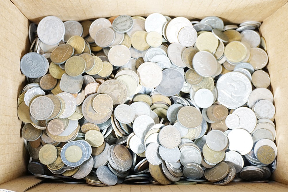 Doos met ca. 10 kilo eenvoudige wereldmunten.