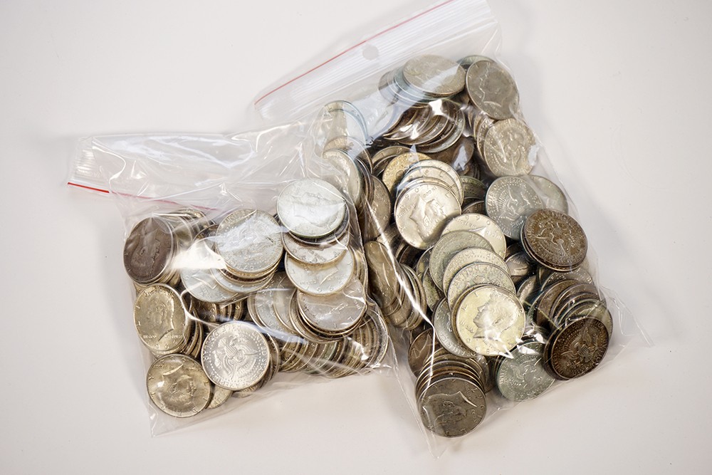 IJzeren geldkistje vol met ½ Dollars 1964 Pres. Kennedy (996 gram) en 1965-1970 (1405 gram). Netto zilver: 1458 gram.