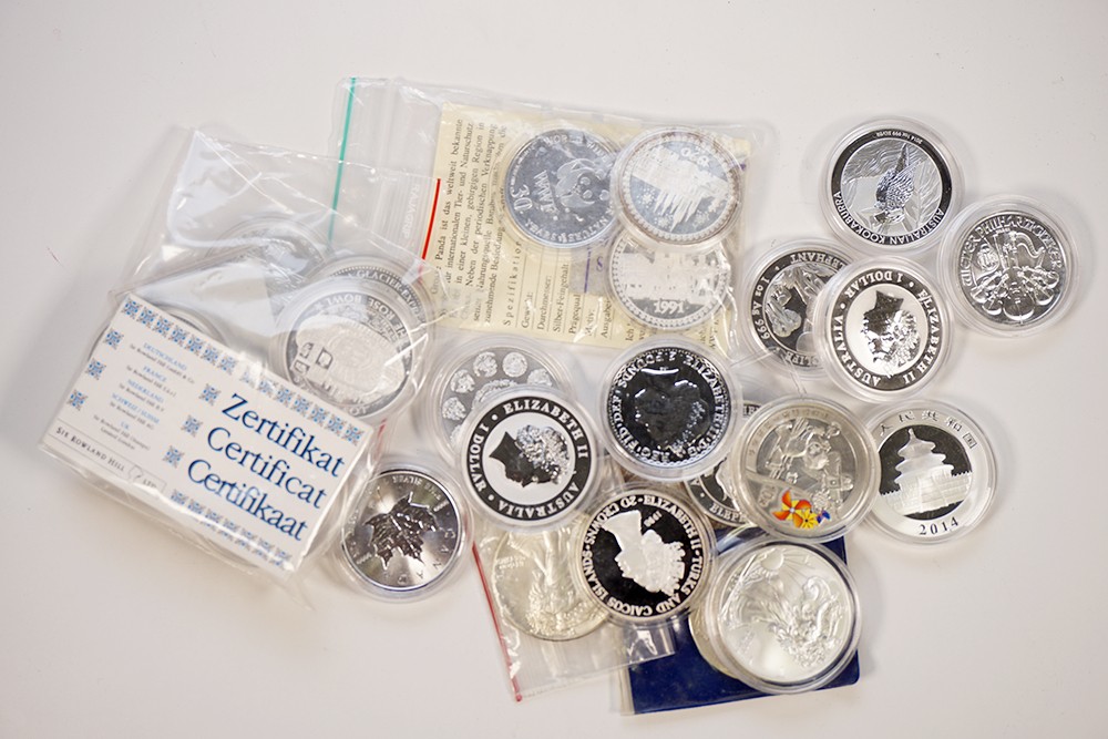 Sigarenkistje met zilveren troy ounce munten (16) van o.a. U.S.A, Australië, China enz. enz. Toegevoegd: zakje met zilveren .999 penningen (12), de meesten ook 31,1 gram. Netto zilver: 339 gram. Totaal netto zilver: 836 gram.