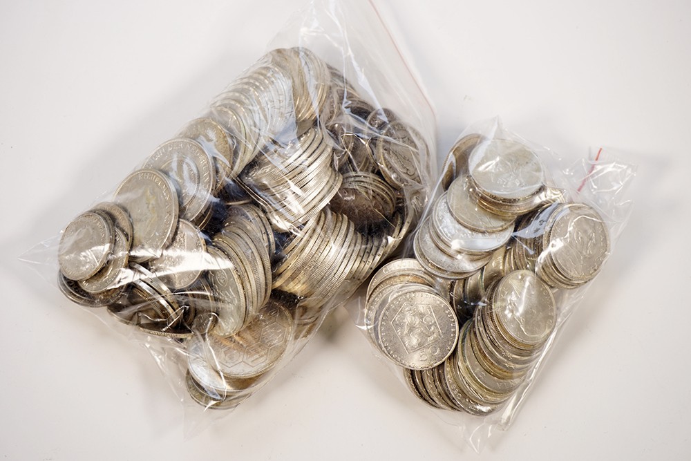 Doosje met onuitgezocht lot zilveren munten 1880 gram gehalte 720/1000 en 810 gram 700/1000.