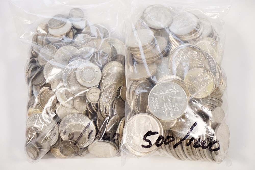 Plastic bak met ongesorteerd buitenlands zilver 1415 gram 640/1000 en 2145 gram 500/1000. Totaal netto 1975 gram.