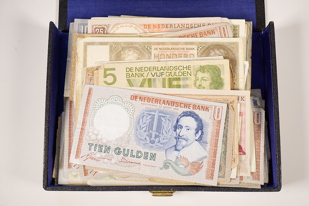 Zwart imitatielederen doosje met circa 200 stuks papiergeld van Hfl. 1,- t/m Hfl. 100,-; meest mindere kwaliteiten.