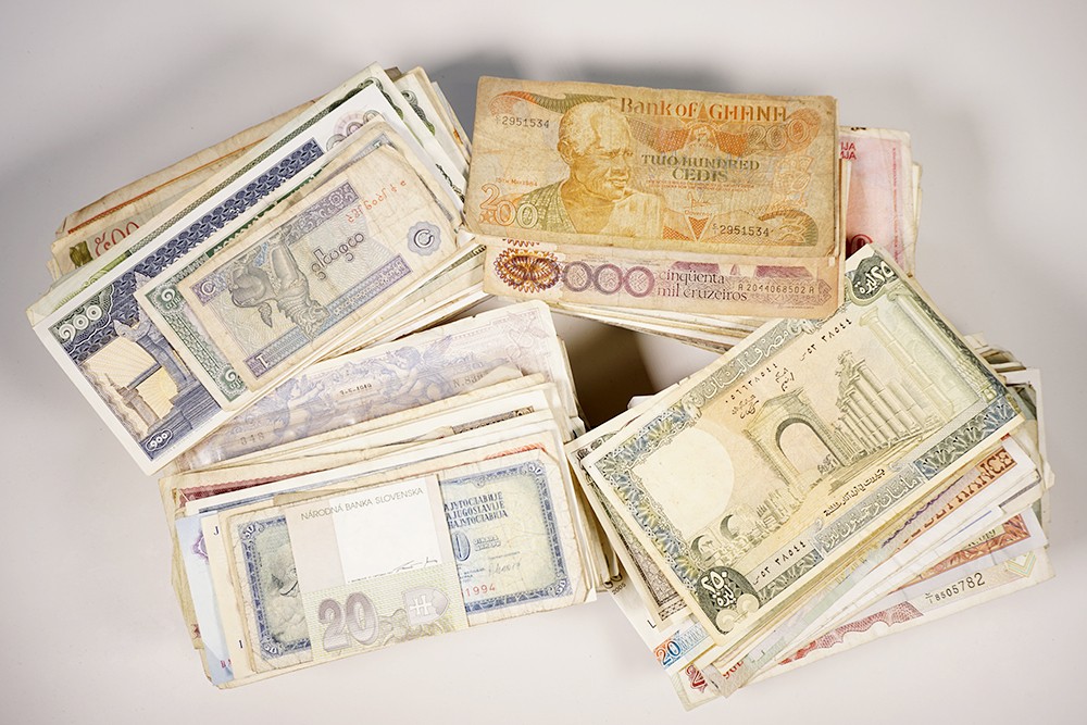 Zwarte schoenendoos vol met papiergeld uit de hele wereld.