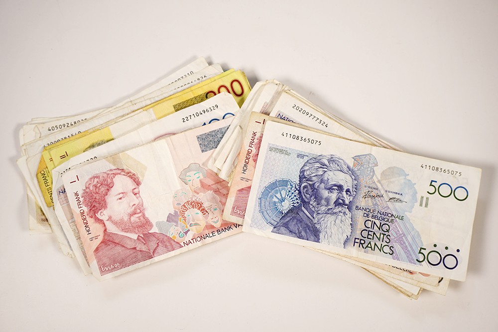 Sigarenkistje met nog inwisselbaar bankpapier van België. Totaal BEF 12.500,--