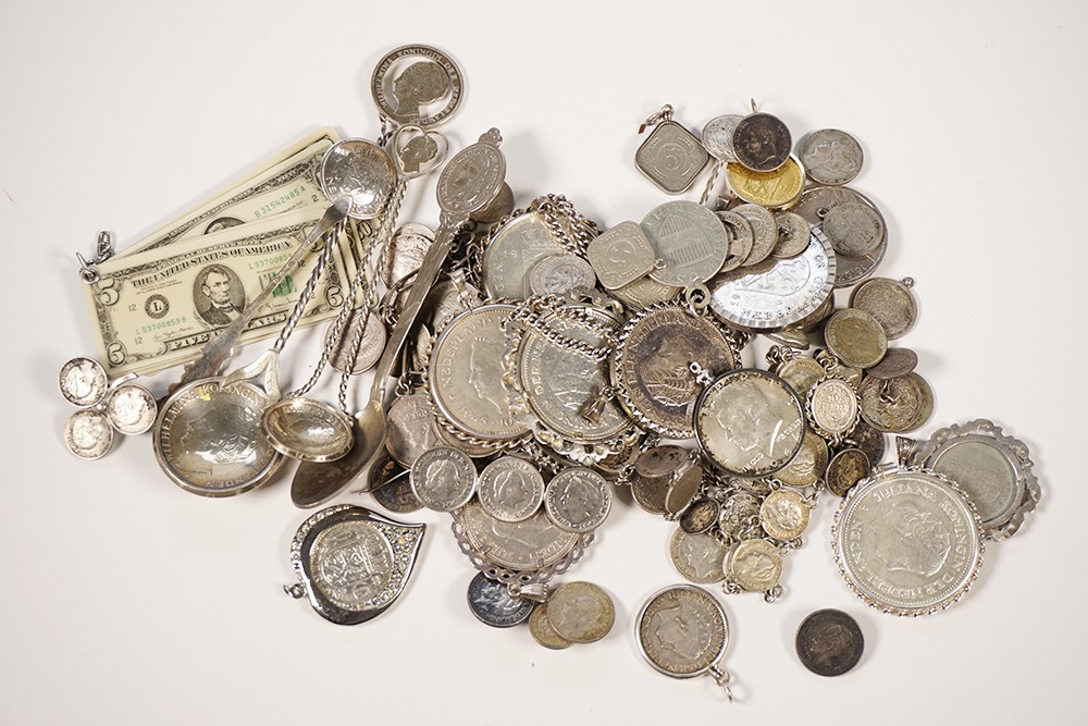 Plastic box met sieraden uit munten vervaardigd: armbanden, hangers, broches, bestek, manchetknopen enz. Veel zilver.